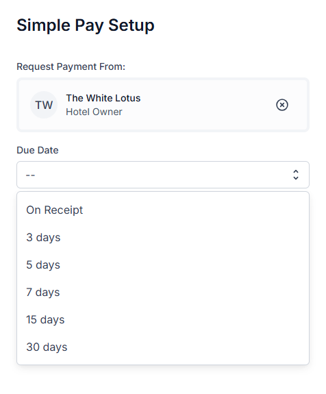 - Setting Due Dates: Payees set the due date by selecting a fixed number of days (the payment term) from a dropdown menu during the Request Payment flow. The due date is automatically calculated from the date the request is created.
